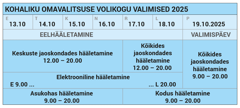 Kohaliku omavalitsuse volikogu valimisnädal on 13. oktoobrist kuni 19. oktoobrini. 13. kuni 18. oktoobrini toimub eel- ja elektrooniline hääletamine. Valimispäeval, 19. oktoobril toimub hääletamine ainult jaoskondades. Ruhnu valimisjaoskond asub vallamajas.